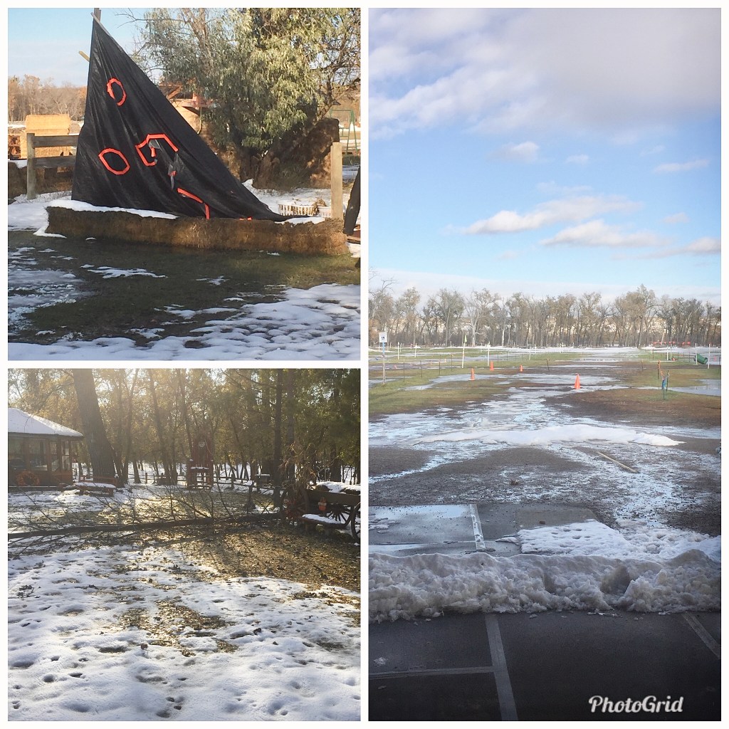 In the mean time, here is what we are to… The pictures above show a small glimpse into what the storm brought our way… Our sling shot tarp needs repair, we have tree’s down that need cleaning, and we are hoping that everything melts off and dries out.